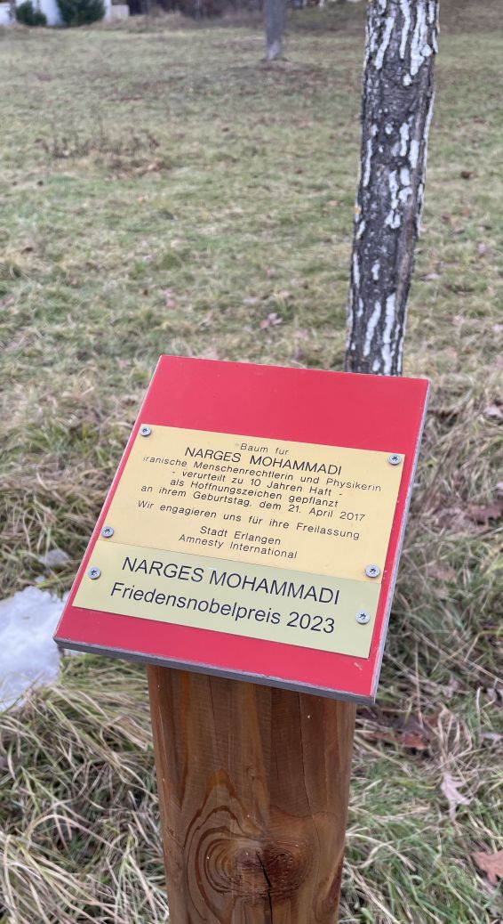 Narges Mohammadi, Trägerin des Friedensnobelpreis 2023, wird vom Regime des Iran immer noch im Gefängnis gehalten. Am 21. April begeht sie ihren 54. Geburtstag, wieder einmal in Unfreiheit. Wir hatten schon 2017 einen Hoffnungsbaum für sie im Röthelheimpark in Erlangen gepflanzt. An diesem Baum wollen wir uns versammeln und ihren Geburtstag feiern.